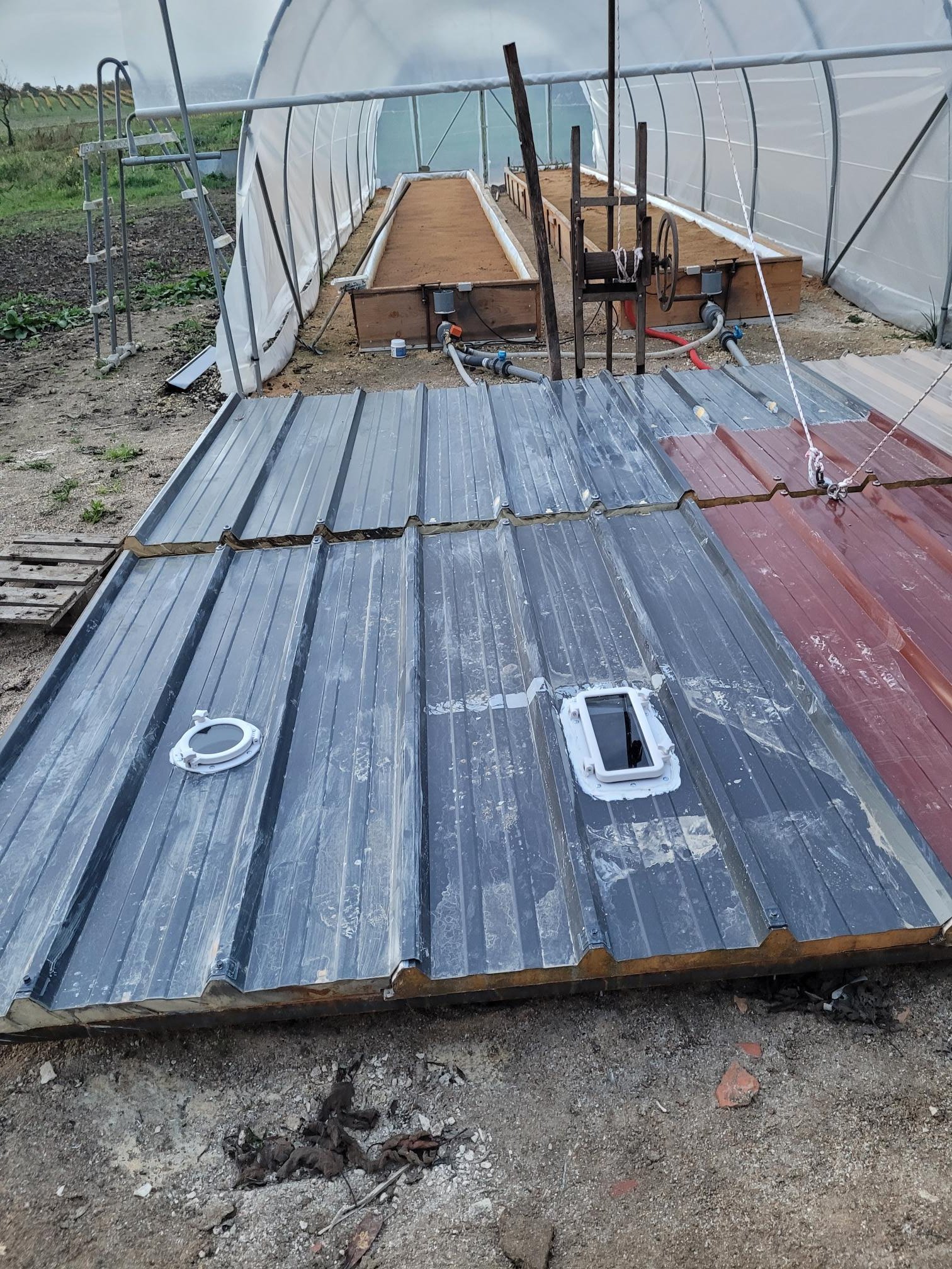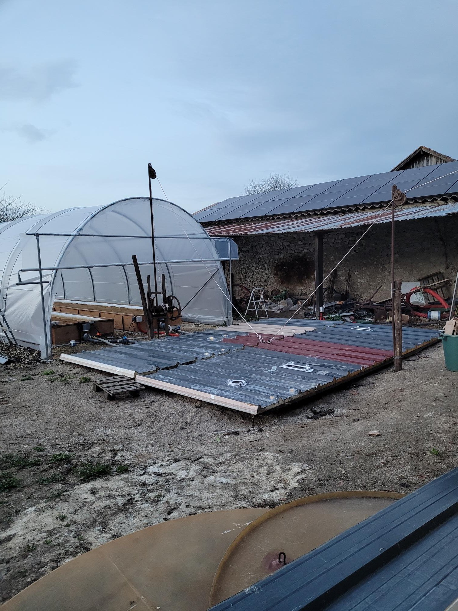 sur cette photo on voit la serre, les tôles isolée de protection des bacs et un des treuils de relevage "maison" fait dans un vieux fouloir à vendange