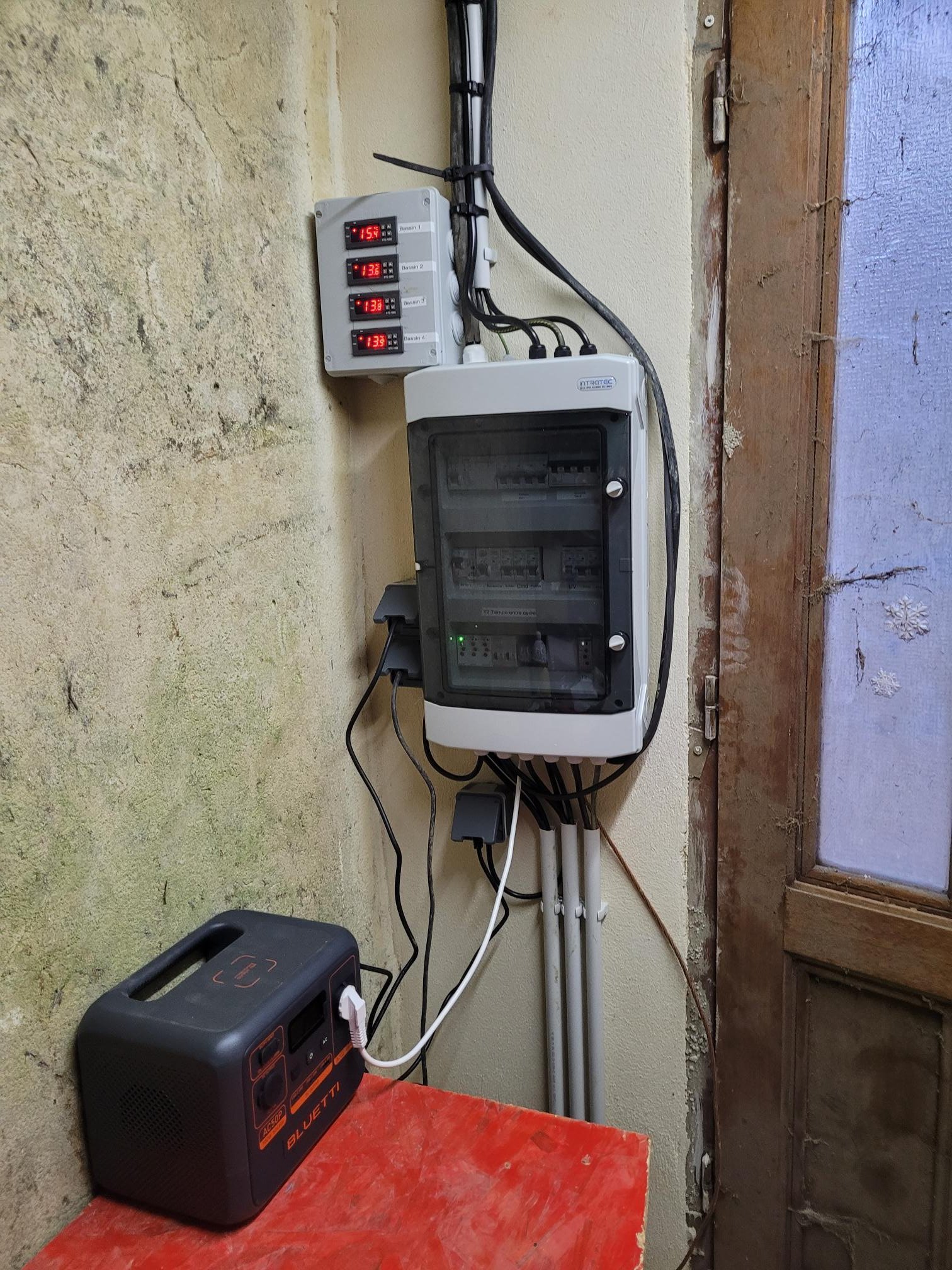là c'est le tableau électrique avec les automatismes, les tempo et en haut la température de chacun des 3 bacs à poissons plus celle du bac de réception des 2 sabloponies, c'est ce bac là qui sera refroidit par le groupe de froid cet été si besoin, ce groupe de 25000 frigories est une pompe à chaleur qui peut éventuellement réchauffer aussi, pour l'instant ce n'est pas prévu mais il peut éventuellement, il est très puissant (7,5kw) j'ai donc prévu de ne le faire marcher que la journée vu que j'ai 22kw crète de panneaux photovoltaïques mais avec les bacs enterrés et protégés par les tôles isolées, je ne devrais pas en avoir besoin trop souvent...